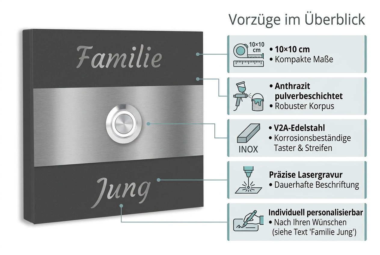 Stellen Sie sich vor, wie Ihre Gäste bereits am Eingang von Ihrer persönlich gestalteten Türklingel begrüßt werden. Ob klassisch mit Familienname, modern mit Hausnummer oder kreativ mit Ihrem Lieblingsmotiv - mit der Bremen-Türklingel setzen Sie ein Statement für Qualität und Stil.