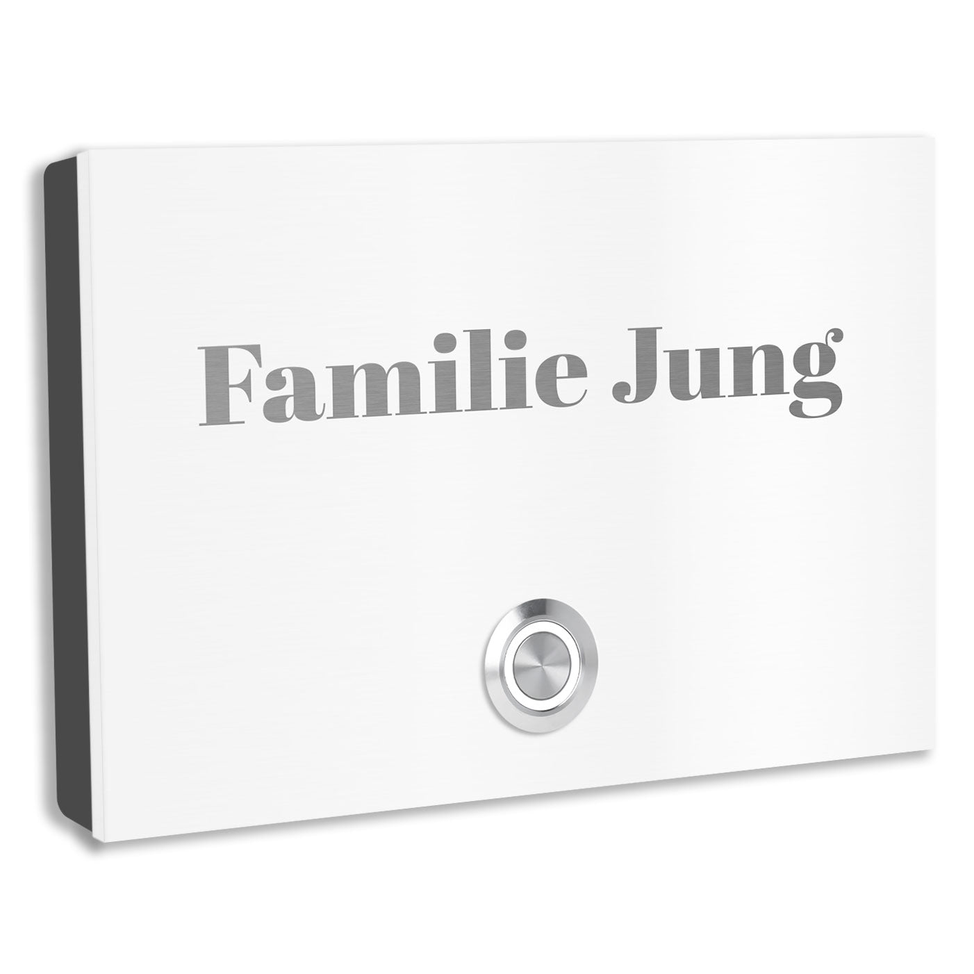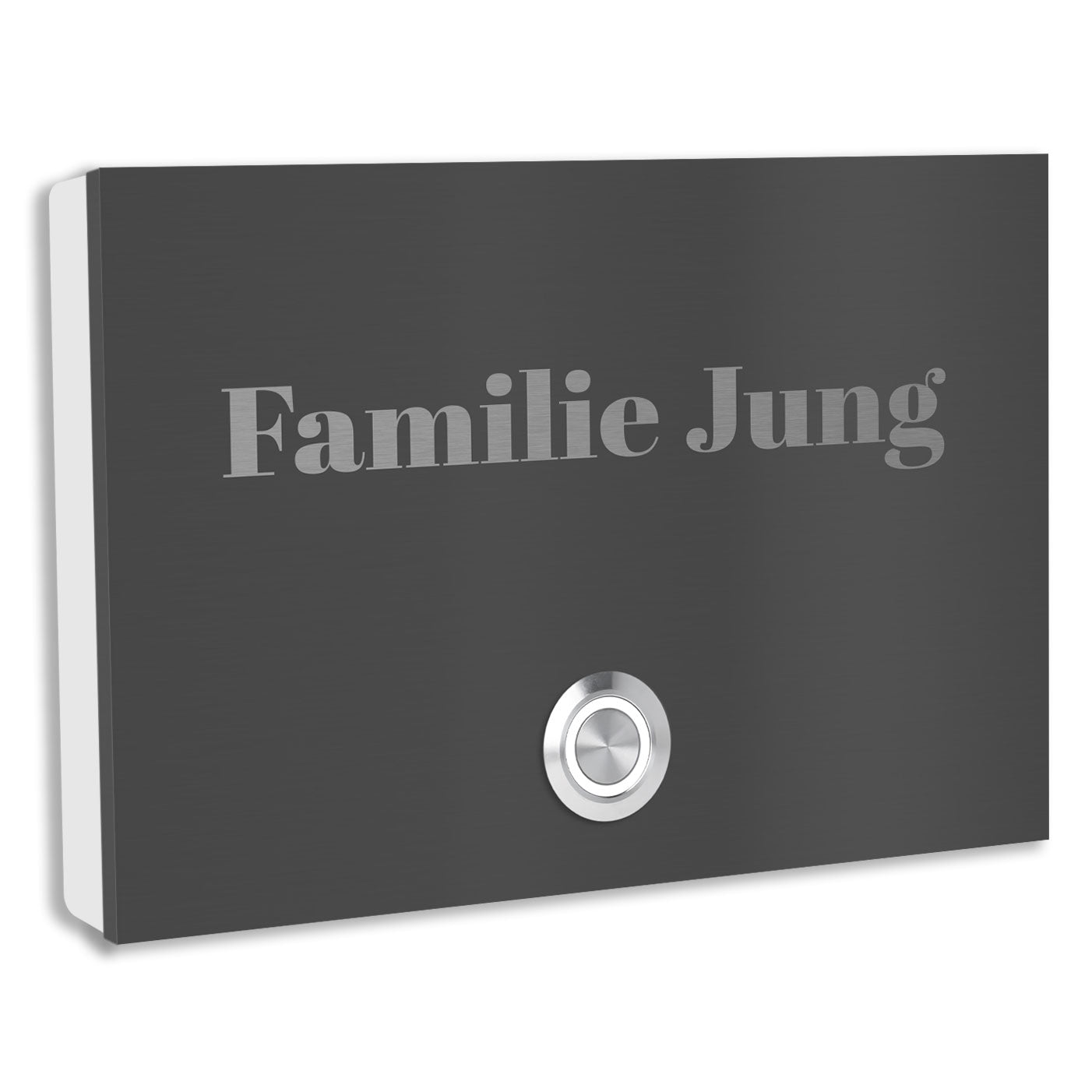 Wahlweise als Aufputz Türklingel mit Aufputzrahmen Wir haben für unsere Aufputzrahmen einen speziellen Kunststoff gewählt der robust ist und unseren hohen Ansprüchen an Belastbarkeit entspricht. Er wird z.B. in der Industrie für Karosserieteile und bei der Produktion von Bauteilen für Elektrogeräte wie Waschmaschinenblenden sowie für Oberflächen von Fensterrahmen eingesetzt. Der Aufputzrahmen ist 11 mm flach und in den Farben Anthrazit oder Weiß wählbar.