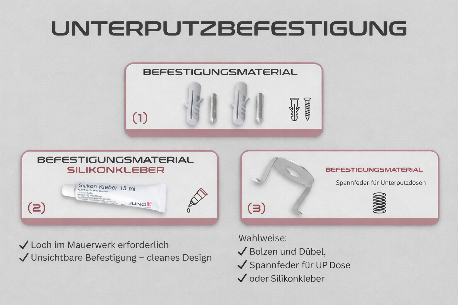 - Wahlweise Aufputz- oder Unterputzmontage