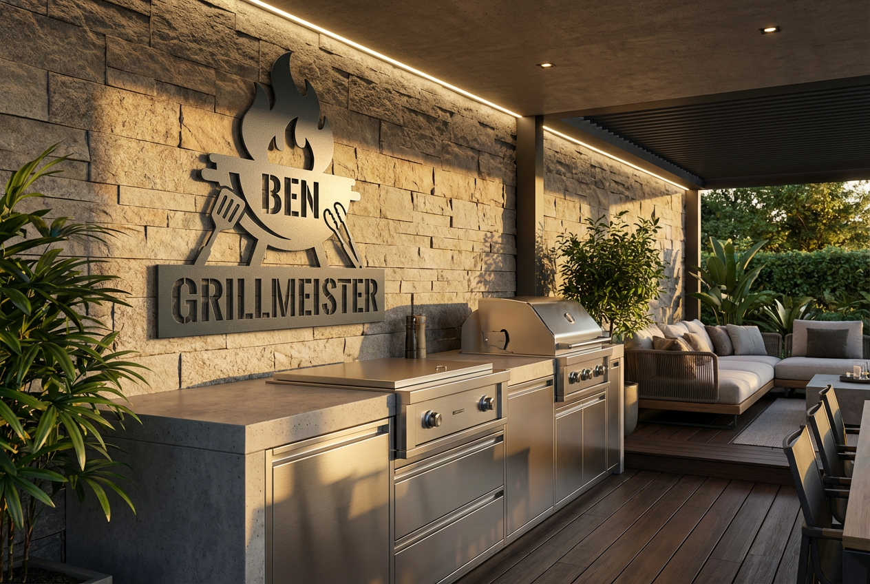 Dieses Grillschild macht deinen Grillplatz zu etwas Besonderem. Gefertigt aus echtem V2A Edelstahl, wetterfest, langlebig und sauber graviert – perfekt für Terrasse, Outdoor-Küche oder Grill-Lounge.