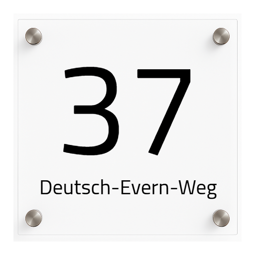 Mit diesem hochwertigen Schild aus UV-beständigem Acrylglas kombinierst du modernes Design mit praktischer Funktion. Individuell bedruckt mit deiner Hausnummer und Straße – in der Schriftart und Farbe deiner Wahl – entsteht ein stilvoller Blickfang für jeden Eingangsbereich.