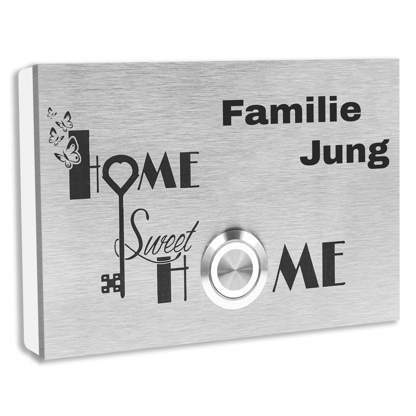 London 12 x 8 cm Edelstahl (V2A) Türklingel - Motiv "Home Sweet Home" - mit Gravur - LED - Aufputz / Unterputz