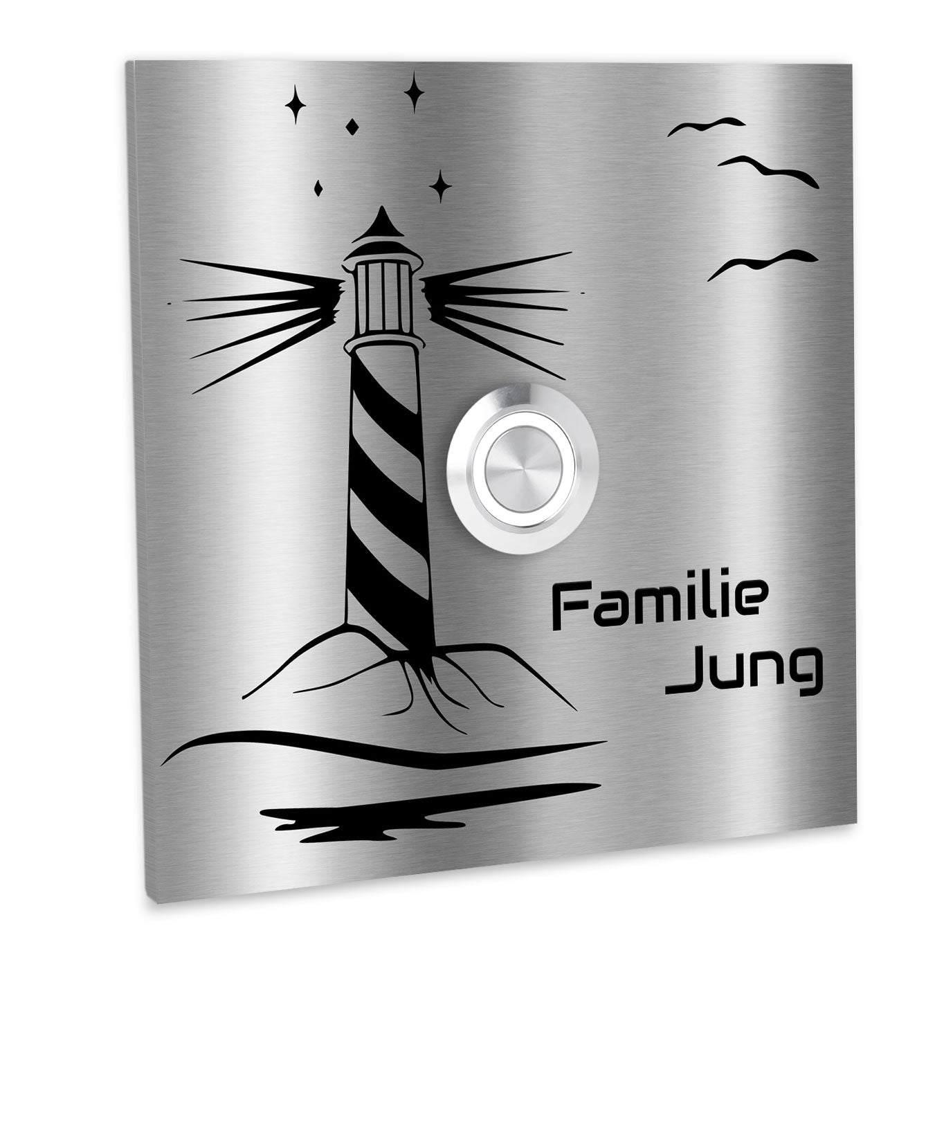 Bochum 10 x 10 cm Edelstahl (V2A) Türklingel - Motiv "Leuchtturm" - mit Gravur - Edelstahl gebürstet - LED - Aufputz / Unterputz