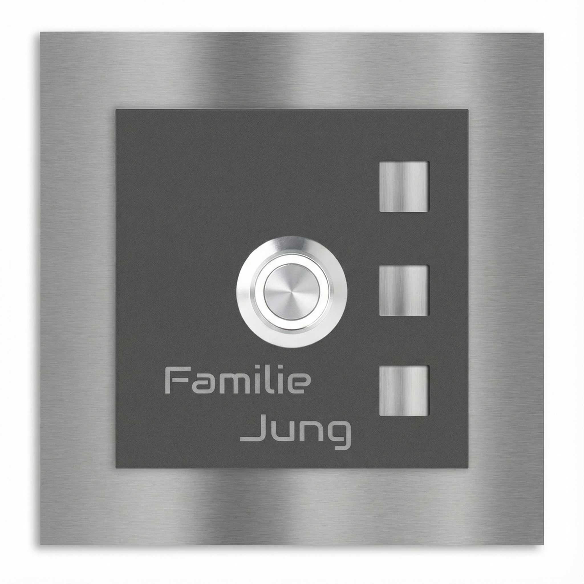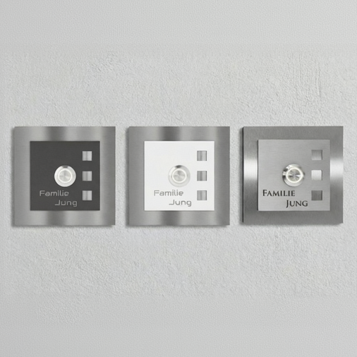 Die zweiteilige Konstruktion aus gebürstetem V2A Edelstahl mit edler Oberplatte sorgt für Tiefe, Präsenz und einen besonders hochwertigen Look an Ihrer Haustür.