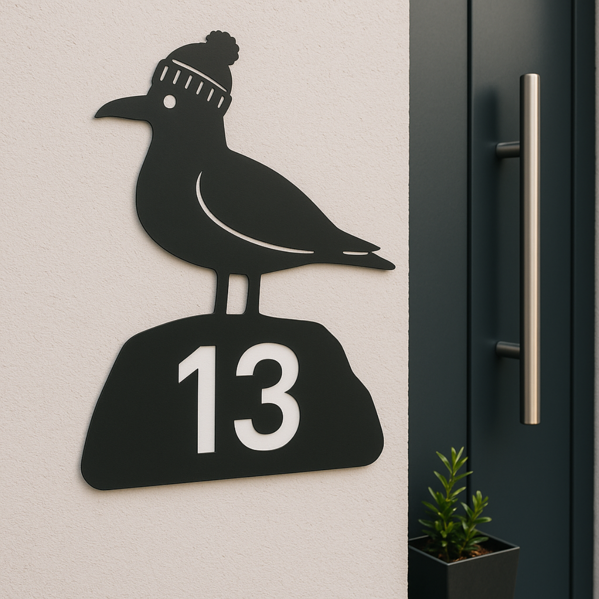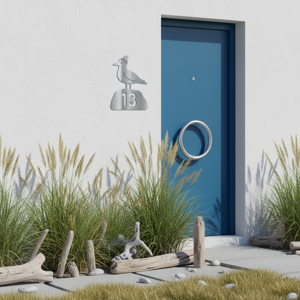 Verleihen Sie Ihrem Zuhause einen maritimen Touch mit unserer personalisierbaren Hausnummer aus hochwertigem V2A Edelstahl. Das charmante Möwen-Design kombiniert Funktionalität mit maritimem Flair.