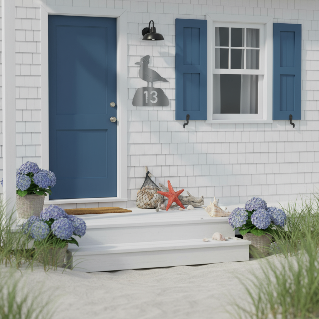 - Design: Möwe auf Felsen mit individueller Hausnummer