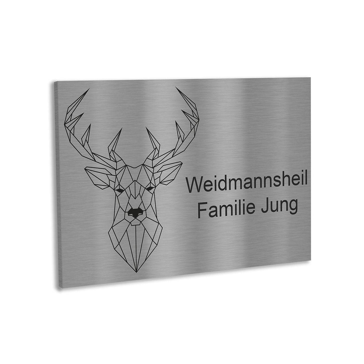 Sie bestehen aus hochwertigem rostfreiem V2a Edelstahl und sind in Edelstahl Korn 240 geschliffen oder RAL 9016 weiß bzw. RAL 7016 anthrazit pulverbeschichtet erhältlich. Wählen Sie aus verschiedenen Tiermotiven wie Hirsch, Elefant, Panda, Fuchs, Löwe, Giraffe, Bär oder Affe. Die Schilder haben eine Größe von 120x80 mm.