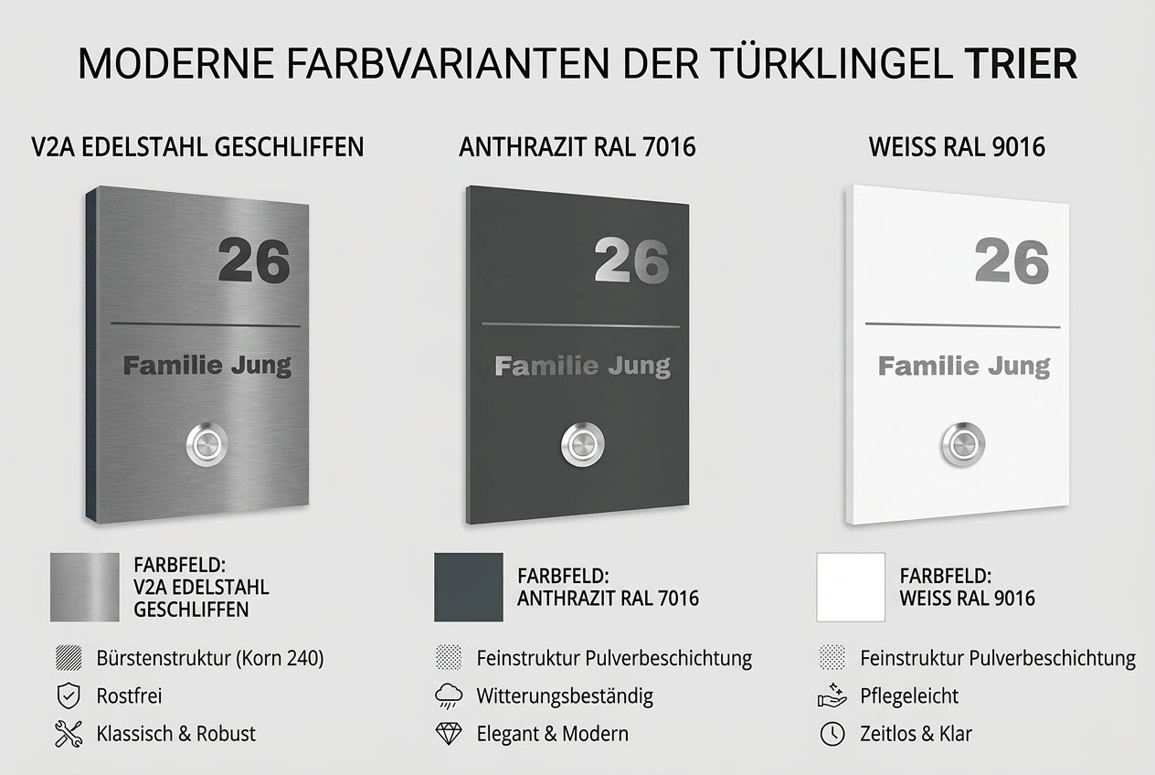 Die Trier Türklingel aus rostfreiem V2A Edelstahl vereint moderne Eleganz mit langlebiger Qualität. Mit den Maßen 17 x 12 cm bietet sie ausreichend Platz für Ihre persönliche Beschriftung.