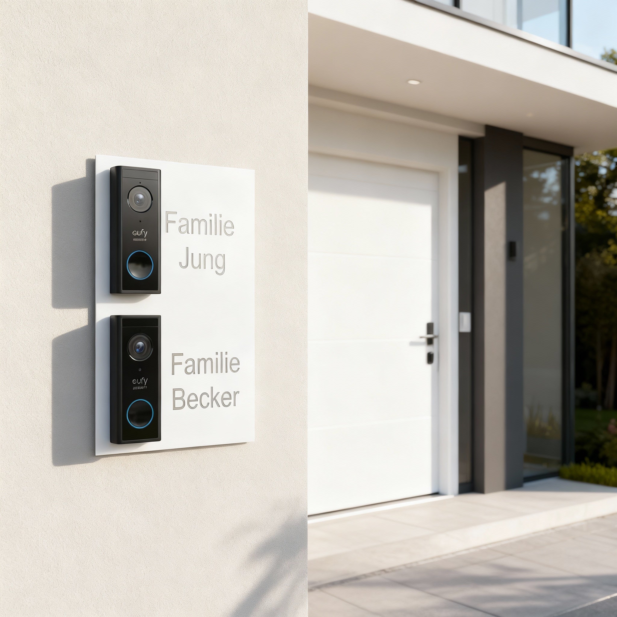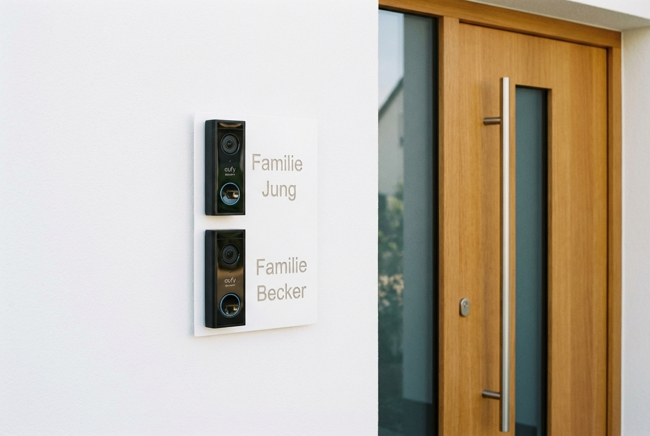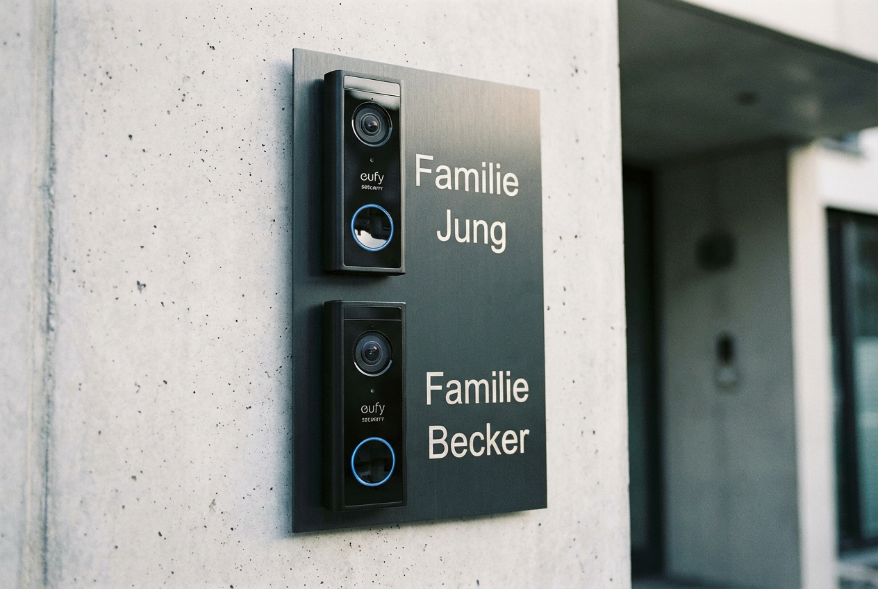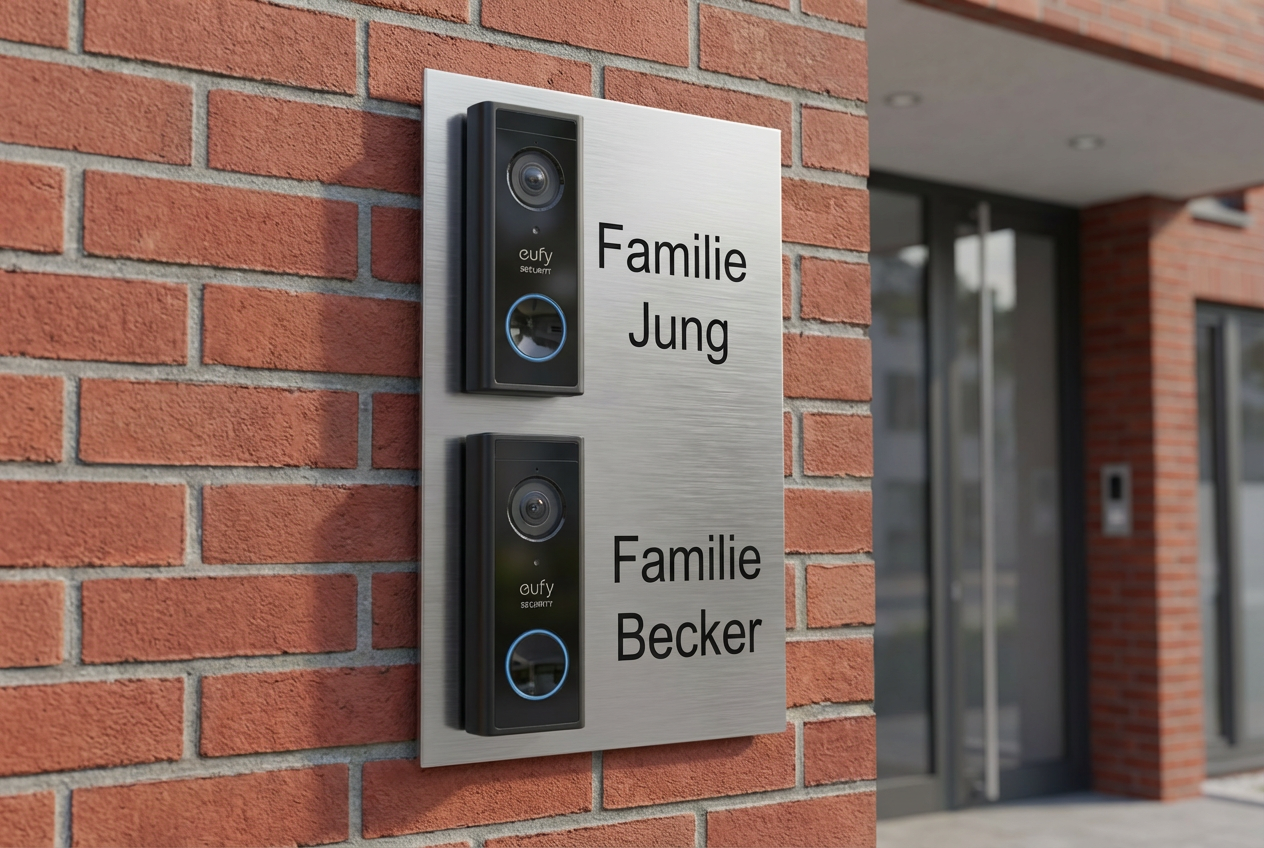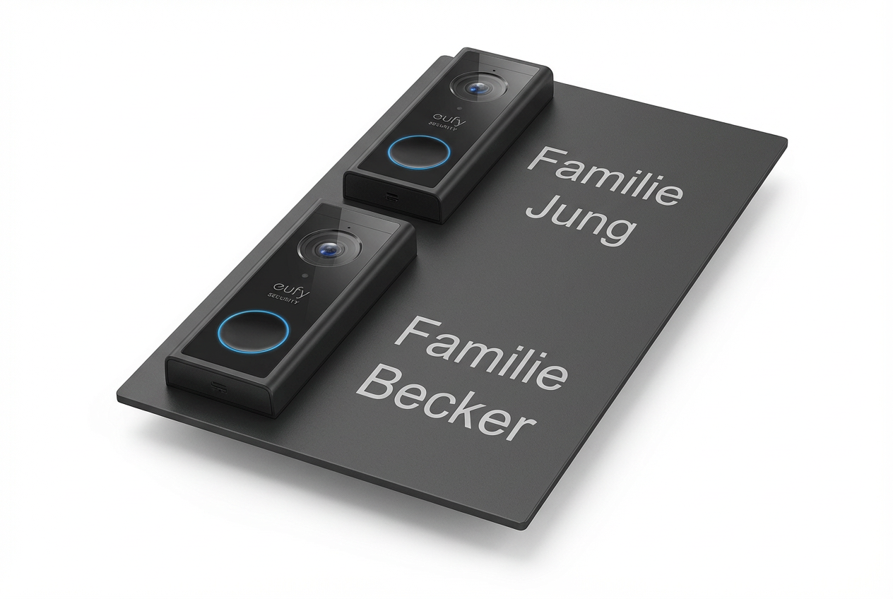 Perfekt für Zweifamilienhäuser - Dieses elegante Türklingel-Schild aus V2A Edelstahl ist speziell für die Eufy S220 Video-Türklingel konzipiert und bietet Platz für zwei Familien.