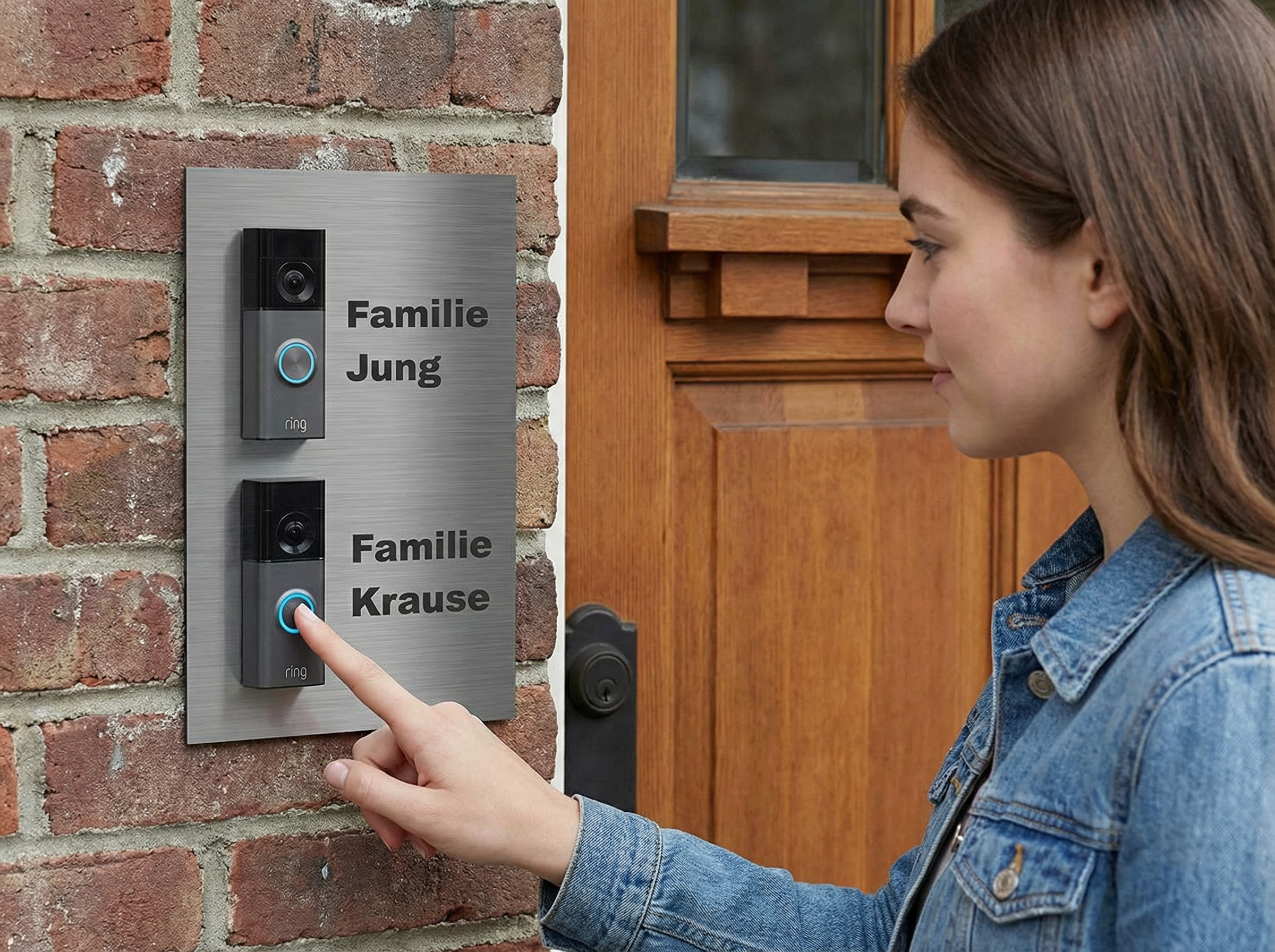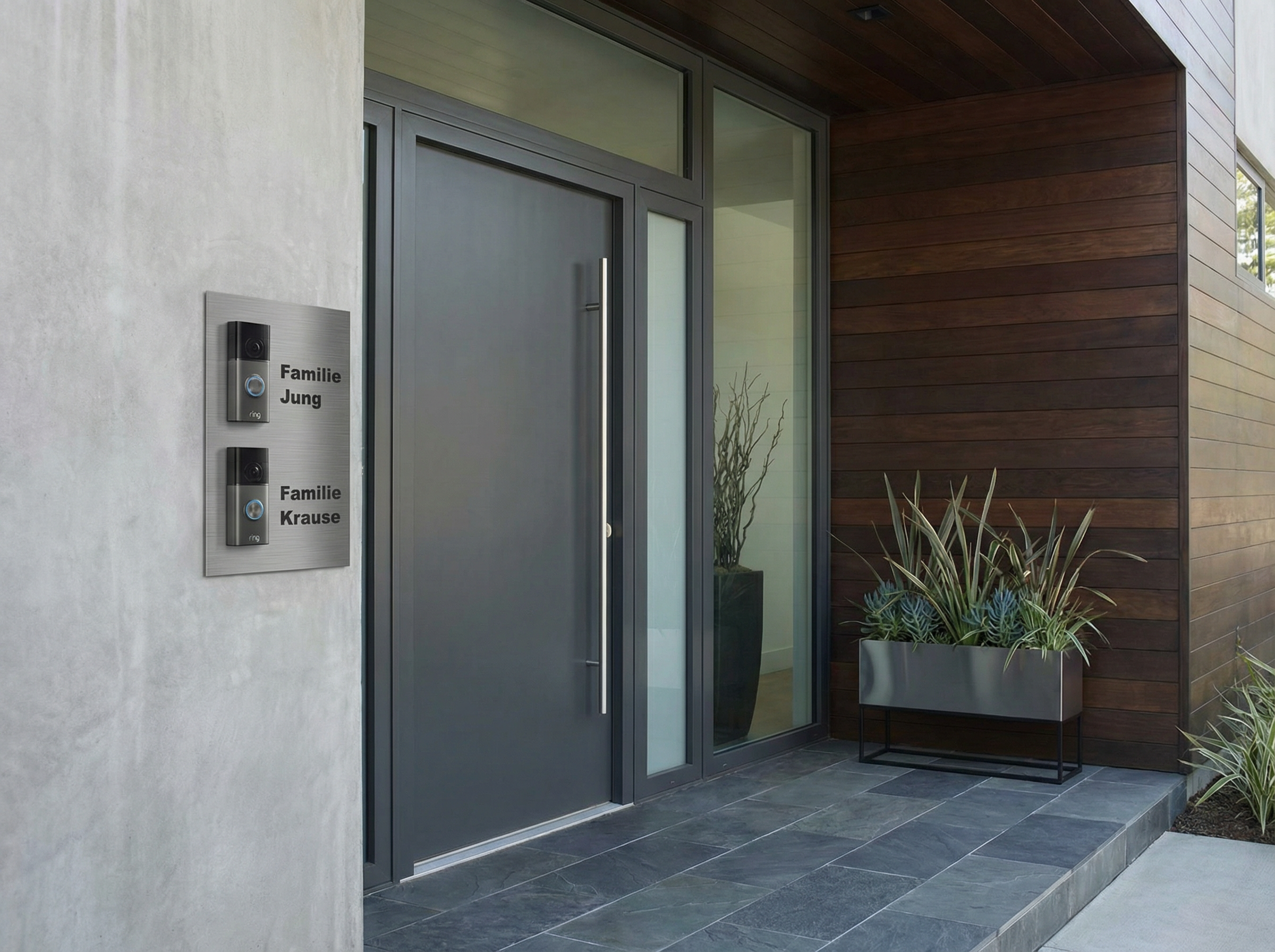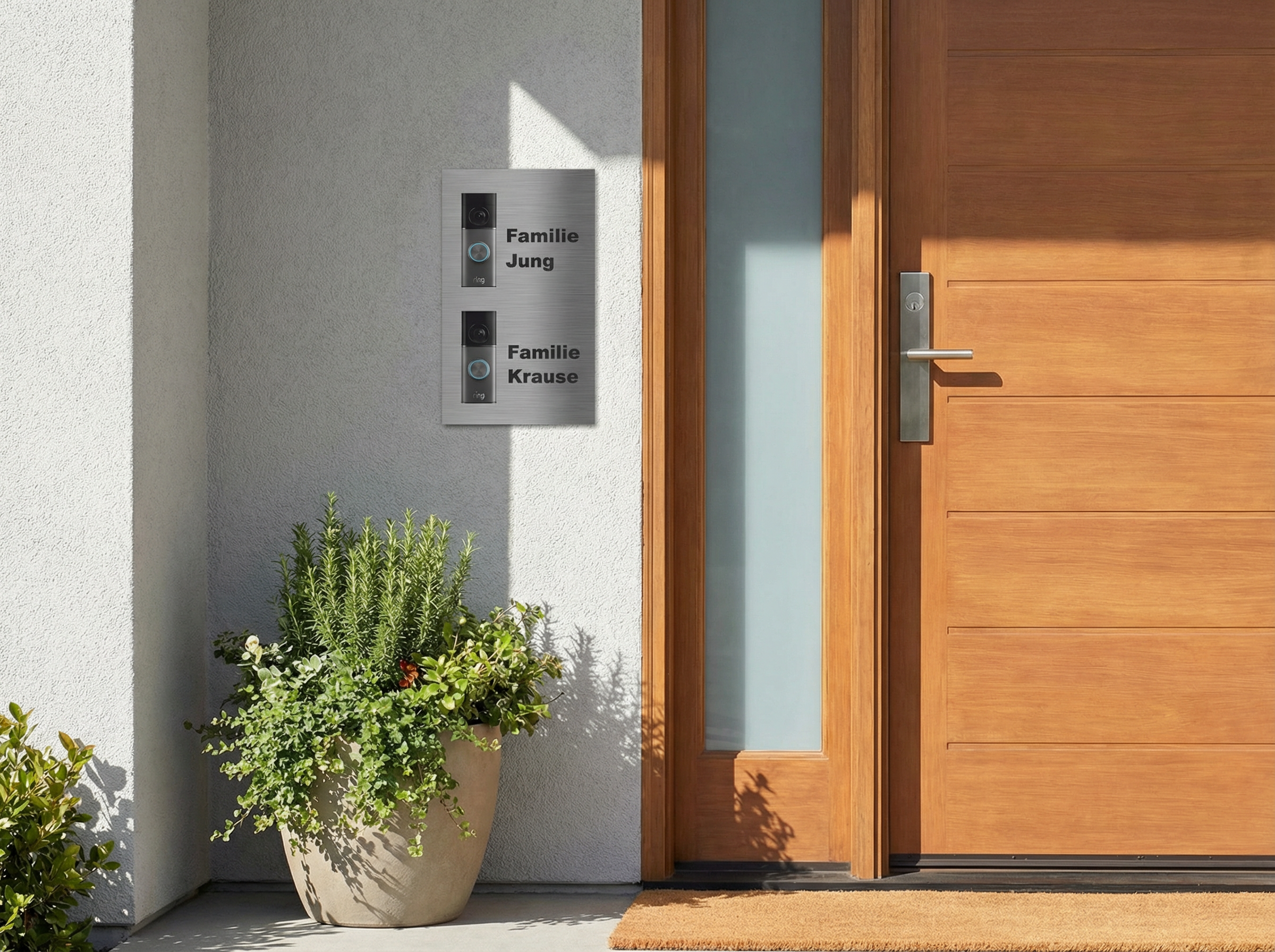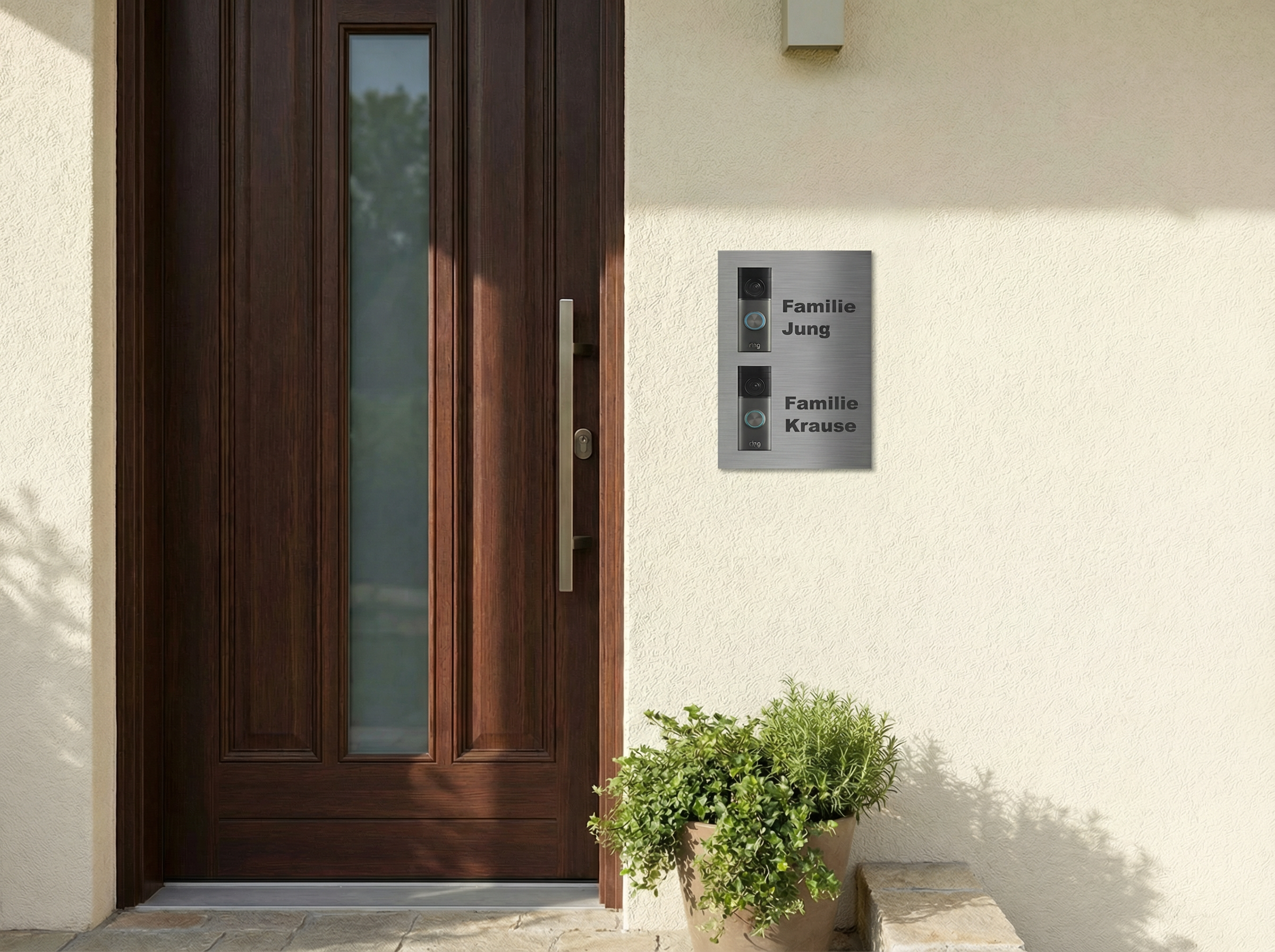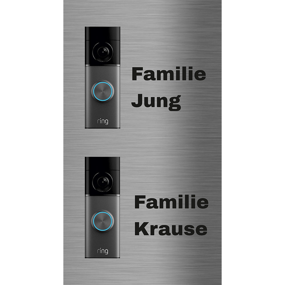 Hochwertiges Dekorschild aus V2A Edelstahl, speziell entwickelt für die Ring Video Doorbell Plus und Pro (3rd Generation). Mit den Maßen 200 x 360 mm bietet dieses Schild ausreichend Platz für zwei Namensgravuren und verleiht Ihrem Eingangsbereich eine elegante, moderne Optik.