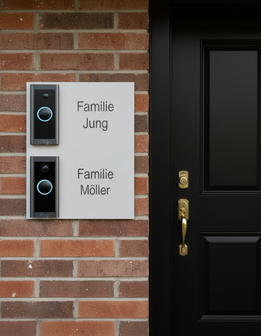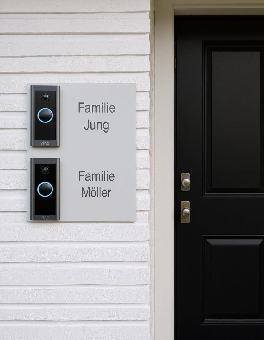 Dieses elegante Türklingel-Schild aus rostfreiem V2A Edelstahl ist speziell für Ring Doorbell Wired Türklingeln entwickelt. Mit den Abmessungen 200 mm x 260 mm und einer Materialstärke von 1,5 mm bietet es die perfekte Größe für zwei Türklingeln.